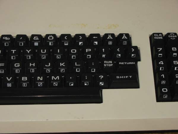 Förutom den svensktillverkade BASIC-utökningen är det ytterligare en sak som gör datorn lite "unik", nämligen att den har svenska tecken. De allra flesta PET-datorer som sålts i Sverige har säkert det, men internationellt sätt är det nog inte så vanligt :-) Placeringen är lite knäpp, det verkar som de bara har ersatt de ursprungliga tangenterna för [\] så att de inte behöver göra om tangentbordsmappningen i ROM.