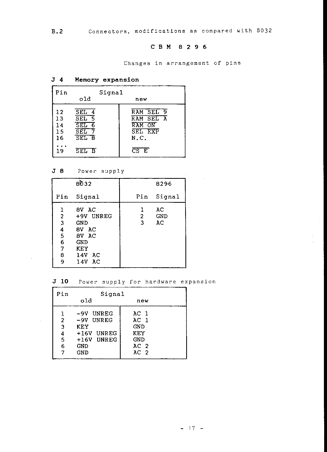 B.2 Connectors, modifications as compared with 8032 C B M 8 2 9 6 Changes in arrangement of pins J 4 Memory expansion +-----------------------------------+ | Pin Signal | | old new | +-----------------+-----------------+ | 12 /SEL 4 | /RAM SEL 9 | | 13 /SEL 5 | /RAM SEL A | | 14 /SEL 6 | /RAM ON | | 15 /SEL 7 | /SEL EXP | | 16 /SEL 8 | N.C. | | ... | | | 19 /SEL B | /CS E | +-----------------+-----------------+ J 8 Power supply +-----------------+-----------------+ | 8032 | 8096 | | | | | Pin Signal | Pin Signal | +-----------------+-----------------+ | 1 8V AC | 1 AC | | 2 +9V UNREG | 2 GND | | 3 GND | 3 AC | | 4 8V AC | | | 5 8V AC | | | 6 GND | | | 7 KEY | | | 8 14V AC | | | 9 14V AC | | +-----------------+-----------------+ J 10 Power supply for hardware expansion +-----------------------------------+ | Pin Signal | | old new | +-----------------+-----------------+ | 1 -9V UNREG | AC 1 | | 2 -9V UNREG | AC 1 | | 3 KEY | GND | | 4 +16V UNREG| KEY | | 5 +16V UNREG| GND | | 6 GND | AC 2 | | 7 GND | AC 2 | +-----------------+-----------------+ - 17 -