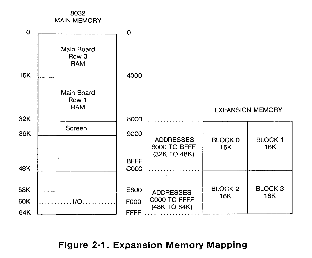[scanned image] 0 +----------------+ 0000 | | | | | | | | | | | | | | | | 16K +----------------+ 4000 | | | | | | | | | | | | | | | | 32K +----------------+ 8000 ............. +--------------+ +--------------+ | Screen | | | | | +----------------+ 9000 | | | | | | ADDRESSES | BLOCK 0 | | BLOCK 1 | | | 8000 TO BFFF | 16K | | 16K | | | (32K TO 48K) | | | | | | | | | | | | BFFF | | | | 48K +----------------+ C000 ............. +--------------+ +--------------+ | | | | | | +----------------+ | | | | | | ADDRESSES | BLOCK 2 | | BLOCK 3 | 58K +----------------+ C000 TO FFFF | 16K | | 16K | | | E800 (48K TO 64K) | | | | 60K |......I/O.......| F000 | | | | | | FFFF | | | | 64K +----------------+ +--------------+ +--------------+ Figure 2-1. Expansion memory mapping - 2 -