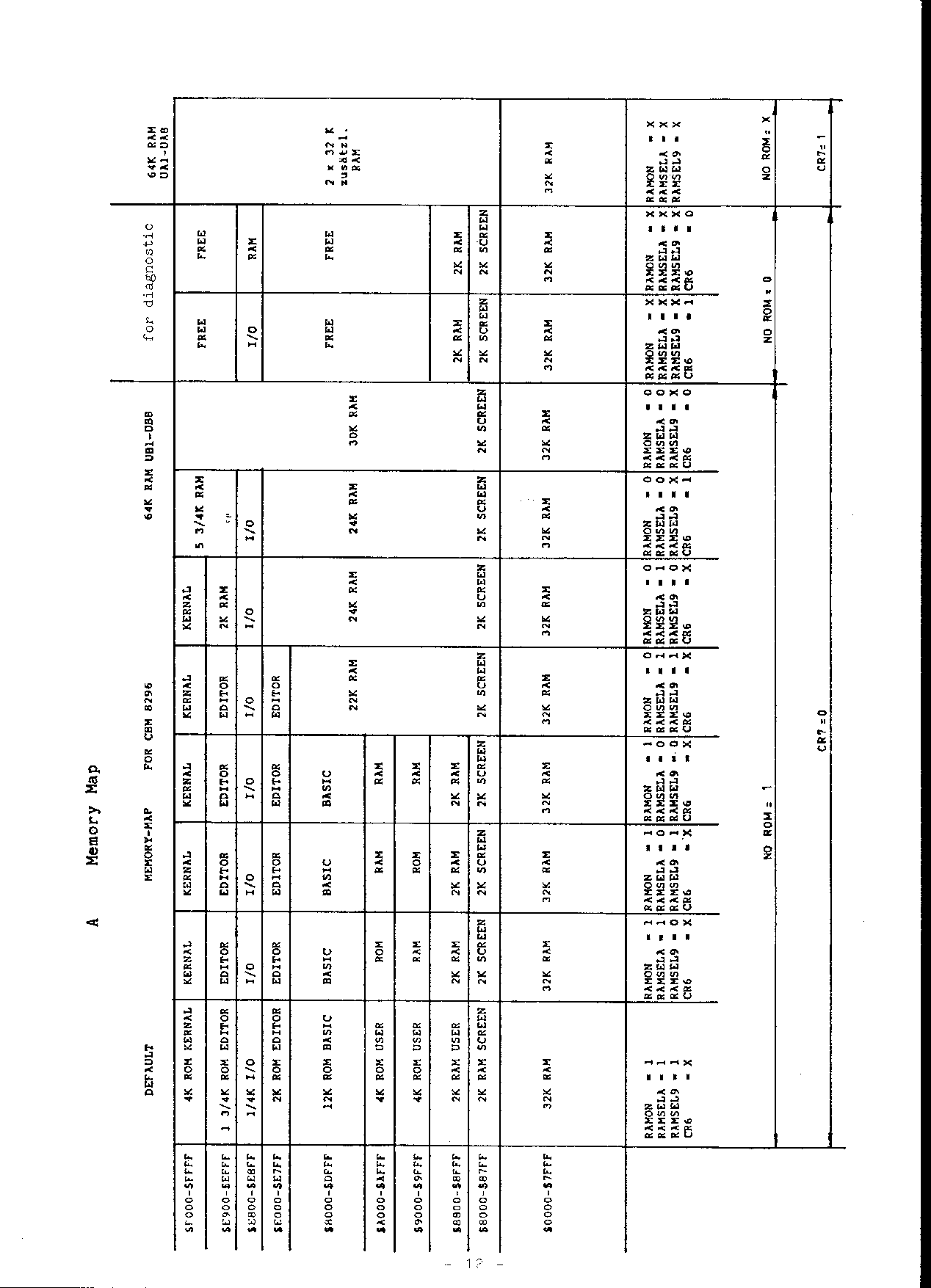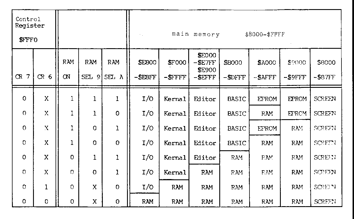 A Memory Map [ I completely rearranged this table. It was printed sideways on the page and repeated earlier info. This would not fit so I omitted the duplicate, presenting only the new mappings in the same form as earlier. ] [scanned image] +-----+--------+------------+-------------------------------------------------+ | |Control | | | | |Register| | main memory $8000 - $FFFF [UB1-UB8] | | | | | [$0000 - $7FFF is always RAM from UB1-UB8] | | |$FFF0 | | | +-----+--------+------------+-------------------------------------------------+ | | I/O |___ ___ ___ | E000 | | ___ | peek|RAM RAM RAM | E800 F000 -E7FF B000 A000 9000 8000 | | NO_ | thr.|___ ___ ___ | E900 | | ROM |CR7 CR6 |ON S.9 S.A |-E8FF -FFFF -EFFF -DFFF -AFFF -9FFF -8FFF | +-----+--------+------------+-------------------------------------------------+ | | | | | | 0 | 0 1 | X X X | I/O Free Free Free Free Free SCREEN | | | | | | | 0 | 0 0 | X X X | RAM Free Free Free Free Free SCREEN | | | | | | | X | 1 X | X X X | 2 x 32 K zus\"atl. RAM from 64K in UA1-UA8. | | | | | | +-----+--------+------------+-------------------------------------------------+ No Rom = 0: marked "for diagnostic". SCREEN: 2000 bytes for screen memory, and 2096 bytes of available RAM. - 12 -