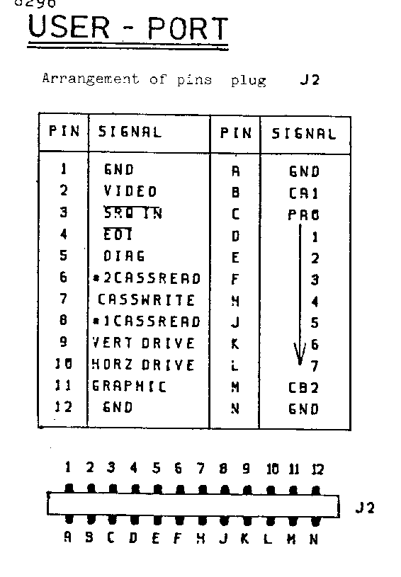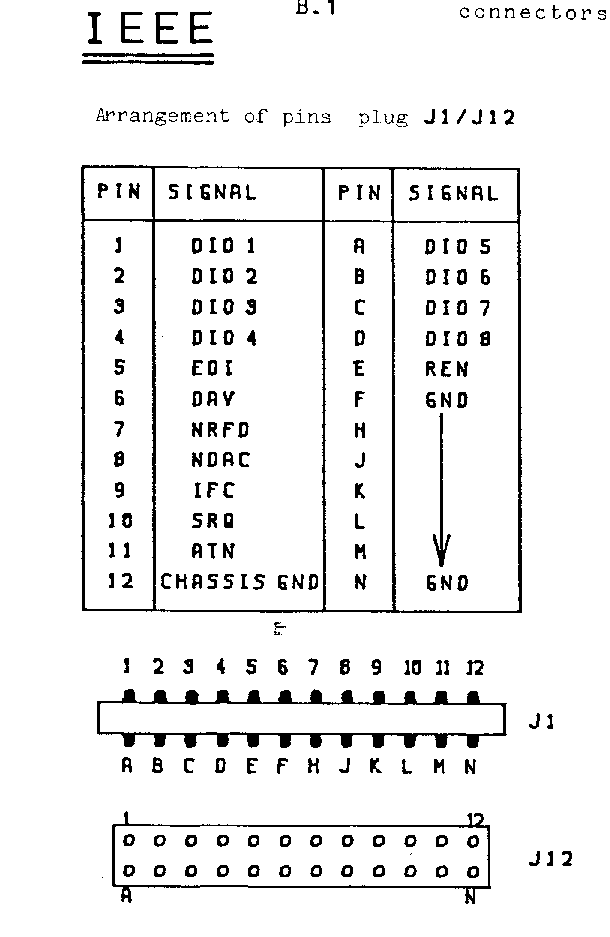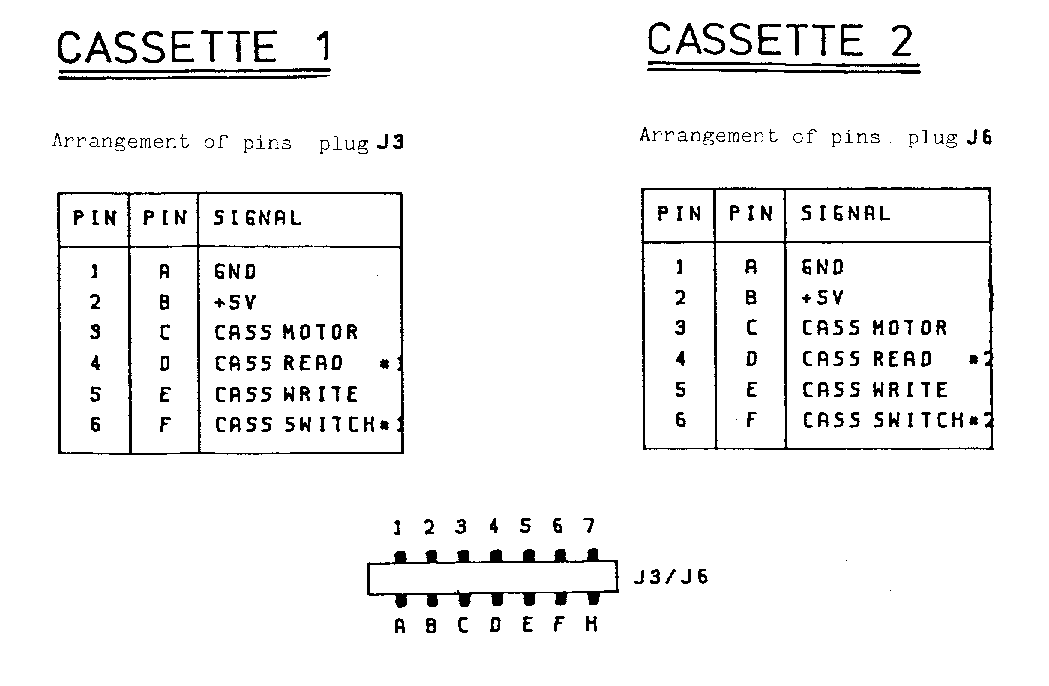 B.1 connectors 8296 IEEE USER - PORT ==== =========== Arrangement of pins plug J1/J12 Arrangement of pins plug J2 +-----+-------------+-----+--------+ +-----+-------------+-----+--------+ | PIN | SIGNAL | PIN | SIGNAL | | PIN | SIGNAL | PIN | SIGNAL | +-----+-------------+-----+--------+ +-----+-------------+-----+--------+ | 1 | DIO 1 | A | DIO 5 | | 1 | GND | A | GND | | 2 | DIO 2 | B | DIO 6 | | 2 | VIDEO | B | CA1 | | 3 | DIO 3 | C | DIO 7 | | 3 | /SRQ IN | C | PA0 | | 4 | DIO 4 | D | DIO 8 | | 4 | /EOI | D | |1 | | 5 | EOI | E | REN | | 5 | DIAG | E | |2 | | 6 | DAV | F | GND | | 6 | #2CASSREAD | F | |3 | | 7 | NRFD | H | | | | 7 | CASSWRITE | H | |4 | | 8 | NDAC | K | | | | 8 | #1CASSREAD | K | |5 | | 9 | IFC | K | | | | 9 | VERT DRIVE | K | |6 | | 10 | SRQ | L | | | | 10 | HORZ DRIVE | L | V7 | | 11 | ATN | M | V | | 11 | GRAPHIC | M | CB2 | | 12 | CHASSIS GND | N | GND | | 12 | GND | N | GND | +-----+-------------+-----+--------+ +-----+-------------+-----+--------+ [ All IEEE signals are active low ] 1 2 3 4 5 6 7 8 9 10 11 12 +--o--o--o--o--o--o--o--o--o--o--o--o--+ | | J1 / J2 [PCB edge connector] +--o--o--o--o--o--o--o--o--o--o--o--o--+ A B C D E F H J K L M N 1 2 3 4 5 6 7 8 9 10 11 12 +------------------------------------+ | o o o o o o o o o o o o | | | J12 [upright pins on PCB] | o o o o o o o o o o o o | +------------------------------------+ A B C D E F H J K L M N CASSETTE 1 CASSETTE 2 ========== ========== Arrangement of pins plug J3 Arrangement of pins plug J6 +-----+-----+----------------------+ +-----+-----+----------------------+ | PIN | PIN | SIGNAL | | PIN | PIN | SIGNAL | +-----+-----+----------------------+ +-----+-----+----------------------+ | 1 | A | GND | | 1 | A | GND | | 2 | B | +5V | | 2 | B | +5V | | 3 | C | CASS MOTOR | | 3 | C | CASS MOTOR | | 4 | D | CASS READ #1| | 4 | D | CASS READ #2| | 5 | E | CASS WRITE | | 5 | E | CASS WRITE | | 6 | F | CASS SWITCH #1| | 6 | F | CASS SWITCH #2| +-----+-----+----------------------+ +-----+-----+----------------------+ 1 2 3 4 5 6 +--o--o--o--o--o--o--+ | | J3 / J6 [card edge connector] +--o--o--o--o--o--o--+ A B C D E F - 13 -