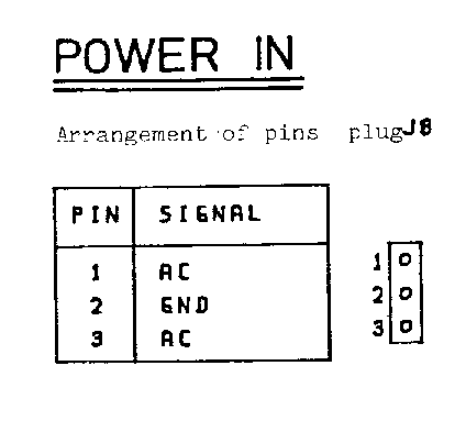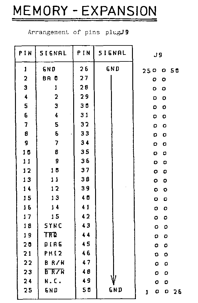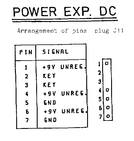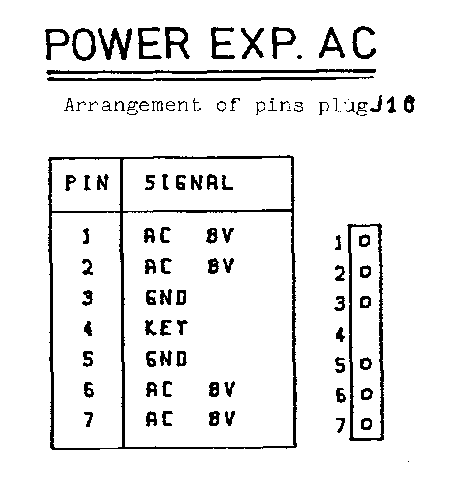 MEMORY - EXPANSION ================== Arrangement of pins plug J9 +-----+-----------+-----+--------+ | PIN | SIGNAL | PIN | SIGNAL | J9 +-----+-----------+-----+--------+ | 1 | GND | 26 | GND | 25 o o 50 | 2 | BA 0 | 27 | | | o o | 3 | 1 | 28 | | | o o | 4 | 2 | 29 | | | o o | 5 | 3 | 30 | | | o o | 6 | 4 | 31 | | | o o | 7 | 5 | 32 | | | o o | 8 | 6 | 33 | | | o o | 9 | 7 | 34 | | | o o | 10 | 8 | 35 | | | o o | 11 | 9 | 36 | | | o o | 12 | 10 | 37 | | | o o | 13 | 11 | 38 | | | o o | 14 | 12 | 39 | | | o o | 15 | 13 | 40 | | | o o | 16 | 14 | 41 | | | o o | 17 | 15 | 42 | | | o o | 18 | SYNC | 43 | | | o o | 19 | /IRQ | 44 | | | o o | 20 | DIAG | 45 | | | o o | 21 | PHI2 | 46 | | | o o | 22 | B R/W | 47 | | | o o | 23 | /B R/W | 48 | | | o o | 24 | N.C | 49 | V | o o | 25 | GND | 50 | GND | 1 o o 26 +-----+-----------+-----+--------+ POWER EXP. AC POWER EXP. DC ============= ============= Arrangement of pins plug J10 Arrangement of pins plug J11 +-----+-----------+ +-----+-----------+ | PIN | SIGNAL | | PIN | SIGNAL | +-----+-----------+ +---+ +-----+-----------+ +---+ | 1 | AC 8V | 1| o | | 1 | +9V UNREG.| 1| o | | 2 | AC 8V | 2| o | | 2 | KEY | 2| | | 3 | GND | 3| o | | 3 | KEY | 3| | | 4 | KEY | 4| | | 4 | +9V UNREG.| 4| o | | 5 | GND | 5| o | | 5 | GND | 5| o | | 6 | AC 8V | 6| o | | 6 | +9V UNREG.| 6| o | | 7 | AC 8V | 7| o | | 7 | GND | 7| o | +-----+-----------+ +---+ +-----+-----------+ +---+ - 15 -