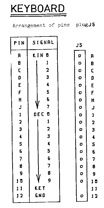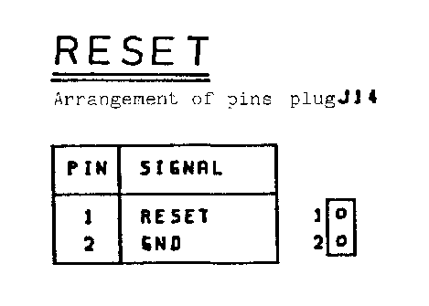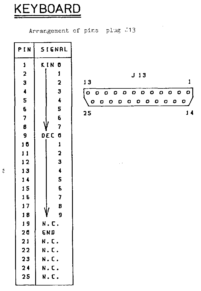 KEYBOARD ======== Arrangement of pins plug J13 +-----+--------+ | PIN | SIGNAL | +-----+--------+ | 1 | KIN 0 | | 2 | | 1 | 13 1 | 3 | | 2 | +---------------------------+ | 4 | | 3 | | o o o o o o o o o o o o o | | 5 | | 4 | \ o o o o o o o o o o o o / | 6 | | 5 | -------------------------- | 7 | | 6 | 25 14 | 8 | V 7 | | 9 | DEC 0 | | 10 | | 1 | | 11 | | 2 | | 12 | | 3 | | 13 | | 4 | | 14 | | 5 | | 15 | | 6 | | 16 | | 7 | | 17 | | 8 | | 18 | V 9 | | 19 | KEY | | 20 | GND | | 21 | N.C. | | 22 | N.C. | | 23 | N.C. | | 24 | N.C. | | 25 | N.C. | +-----+--------+ RESET ===== Arrangement of pins plug J14 +-----+--------+ | PIN | SIGNAL | +-----+--------+ +---+ | 1 | RESET | 1| o | | 2 | GND | 2| o | +-----+--------+ +---+ - 16 -