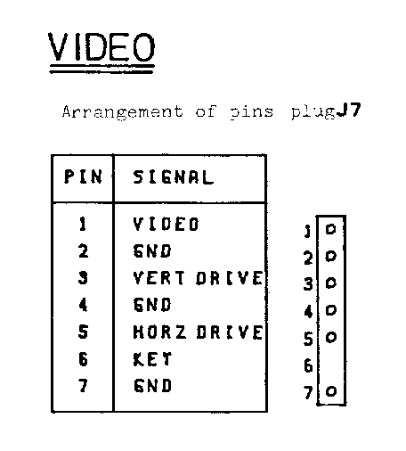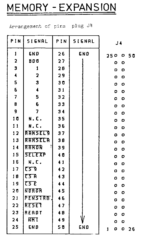 MEMORY - EXPANSION KEYBOARD ================== ======== Arrangement of pins plug J4 Arrangement of pins plug J5 +-----+-----------+-----+--------+ +-----+--------+ | PIN | SIGNAL | PIN | SIGNAL | J4 | PIN | SIGNAL | J5 +-----+-----------+-----+--------+ +-----+--------+ +---+ | 1 | GND | 26 | GND | 25 o o 50 | A | KIN 0 | | o | A | 2 | BD0 | 27 | | | o o | B | | 1 | | o | B | 3 | 1 | 28 | | | o o | C | | 2 | | o | C | 4 | 2 | 29 | | | o o | D | | 3 | | o | D | 5 | 3 | 30 | | | o o | E | | 4 | | o | E | 6 | 4 | 31 | | | o o | F | | 5 | | o | F | 7 | 5 | 32 | | | o o | H | | 6 | | o | H | 8 | 6 | 33 | | | o o | J | V 7 | | o | J | 9 | 7 | 34 | | | o o | 1 | DEC 0 | | o | 1 | 10 | N.C. | 35 | | | o o | 2 | | 1 | | o | 2 | 11 | N.C. | 36 | | | o o | 3 | | 2 | | o | 3 | 12 | /RAMSEL 9 | 37 | | | o o | 4 | | 3 | | o | 4 | 13 | /RAMSEL A | 38 | | | o o | 5 | | 4 | | o | 5 | 14 | /RAMON | 39 | | | o o | 6 | | 5 | | o | 6 | 15 | /SELEXP | 40 | | | o o | 7 | | 6 | | o | 7 | 16 | N.C. | 41 | | | o o | 8 | | 7 | | o | 8 | 17 | /CS 9 | 42 | | | o o | 9 | | 8 | | o | 9 | 18 | /CS A | 43 | | | o o | 10 | V 9 | | o | 10 | 19 | /CS E | 44 | | | o o | 11 | KEY | | | 11 | 20 | /NOROM | 45 | | | o o | 12 | GND | | o | 12 | 21 | /PENSTRB | 46 | | | o o +-----+--------+ +---+ | 22 | /RESET | 47 | | | o o | 23 | READY | 48 | | | o o | 24 | /NMI | 49 | V | o o | 25 | GND | 50 | GND | 1 o o 26 +-----+-----------+-----+--------+ VIDEO POWER IN ===== ======== Arrangement of pins plug J7 Arrangement of pins plug J8 +-----+-----------+ +-----+-----------+ | PIN | SIGNAL | | PIN | SIGNAL | +-----+-----------+ +---+ +-----+-----------+ +---+ | 1 | VIDEO | 1| o | | 1 | AC | 1| o | | 2 | GND | 2| o | | 2 | GND | 2| o | | 3 | VERT DRIVE| 3| o | | 3 | AC | 3| o | | 4 | GND | 4| o | +-----+-----------+ +---+ | 5 | HORZ DRIVE| 5| o | | 6 | KEY | 6| | | 7 | GND | 7| o | +-----+-----------+ +---+ - 14 -