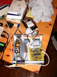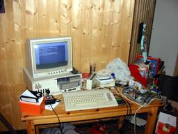 We tried out Asbjørn Djupdal's IEC-ATA interface with a spare disk that I brought along. After figuring out that the disk was jumpered as slave we got it to work, but it was a bit disappointing that it didn't work together with either the Retro Replay, a TFC III or even with JiffyDOS. The only utility cartridge that worked was an Epyx Fastload, but that's just because it does not try to accelerate device 10 (which is the number for the hard disk.