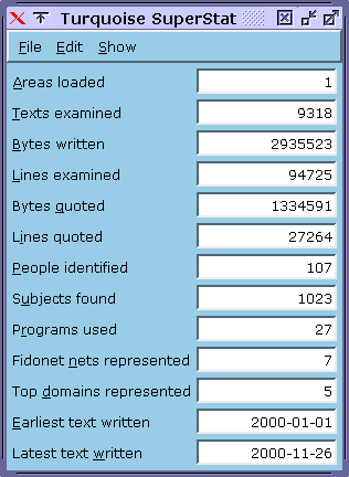 Turquoise SuperStat läser innehållet i en Fidonetmeddelandebas i något av de stödda formaten, eller Usenetgrupper i det vanliga "news spool"-formatet, och skapar statistik inom följande områden: