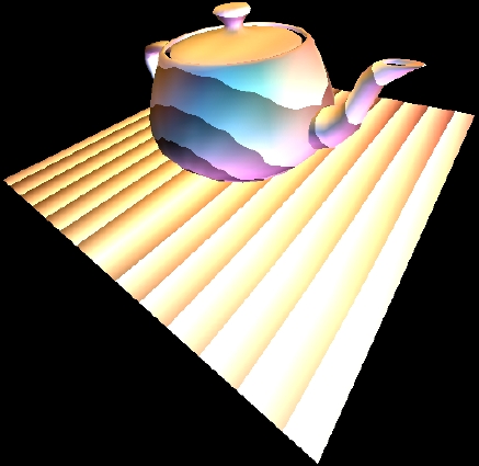 3D-texturmappad tekanna (textur: random), med en färgad lampa och färgade objekt